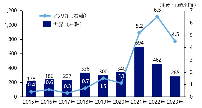 世界及びアフリカにおけるVC取引額(2015年~2023年)