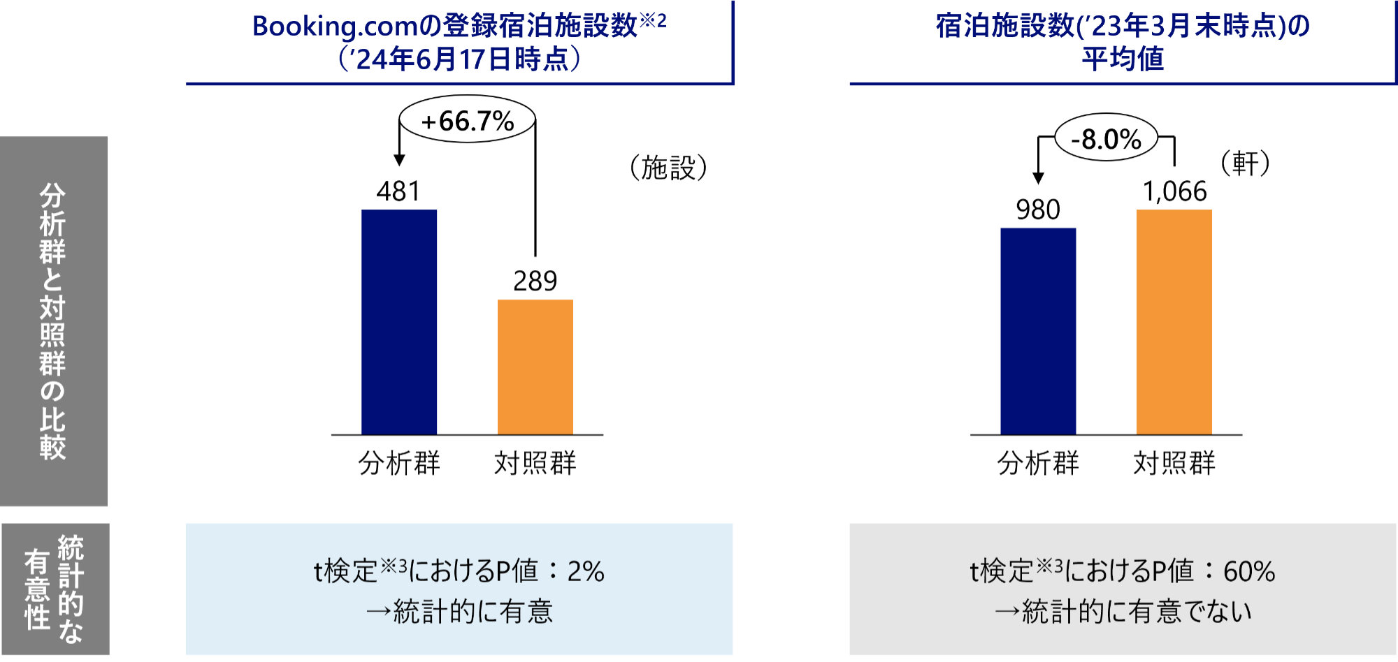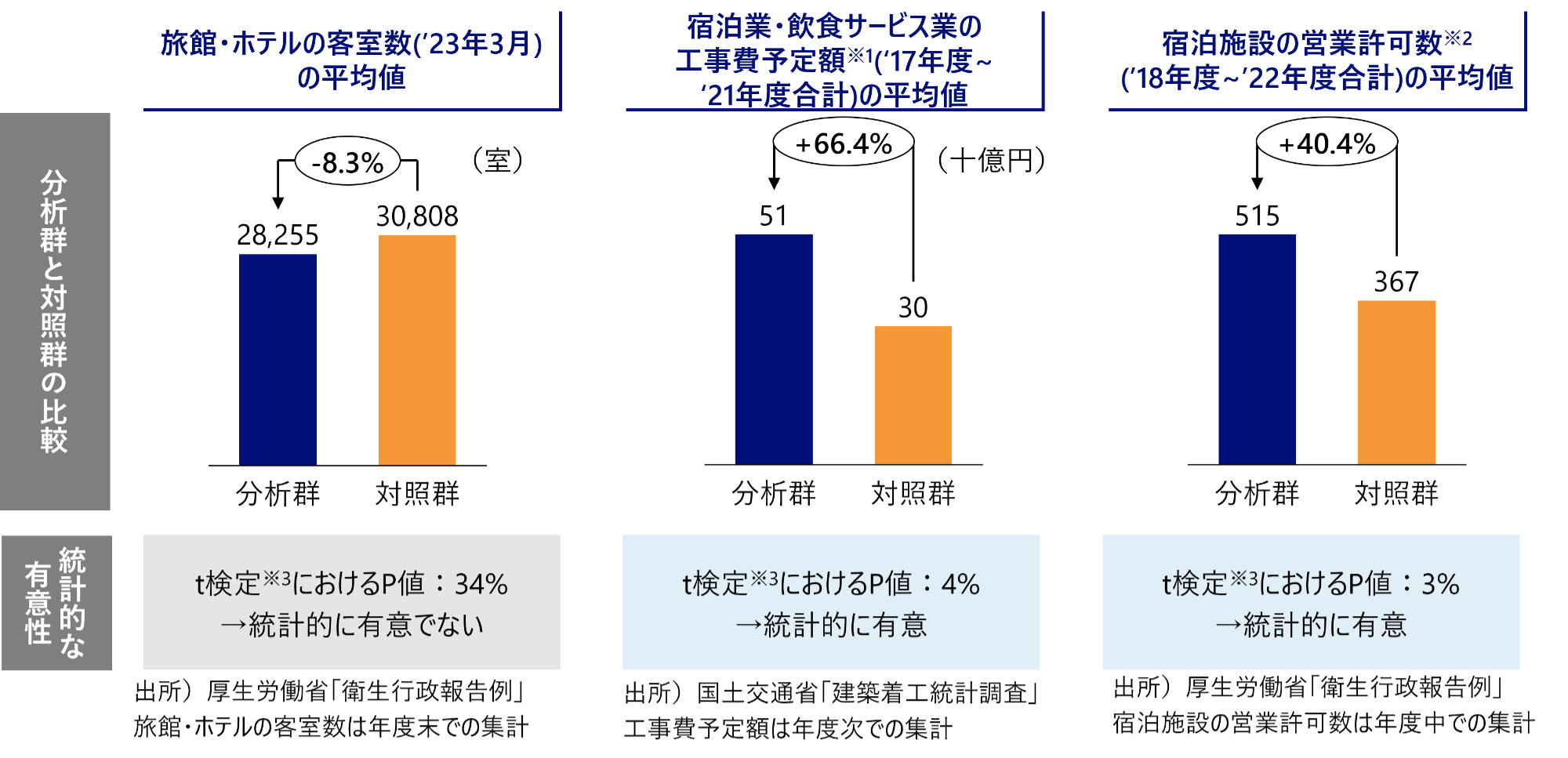 結論として、有意な差があった指標は①宿泊業・飲食サービス業に対する工事費、②宿泊施設の営業許可数、③海外の主要OTA(Booking.com)の登録宿泊施設数の3指標であった。