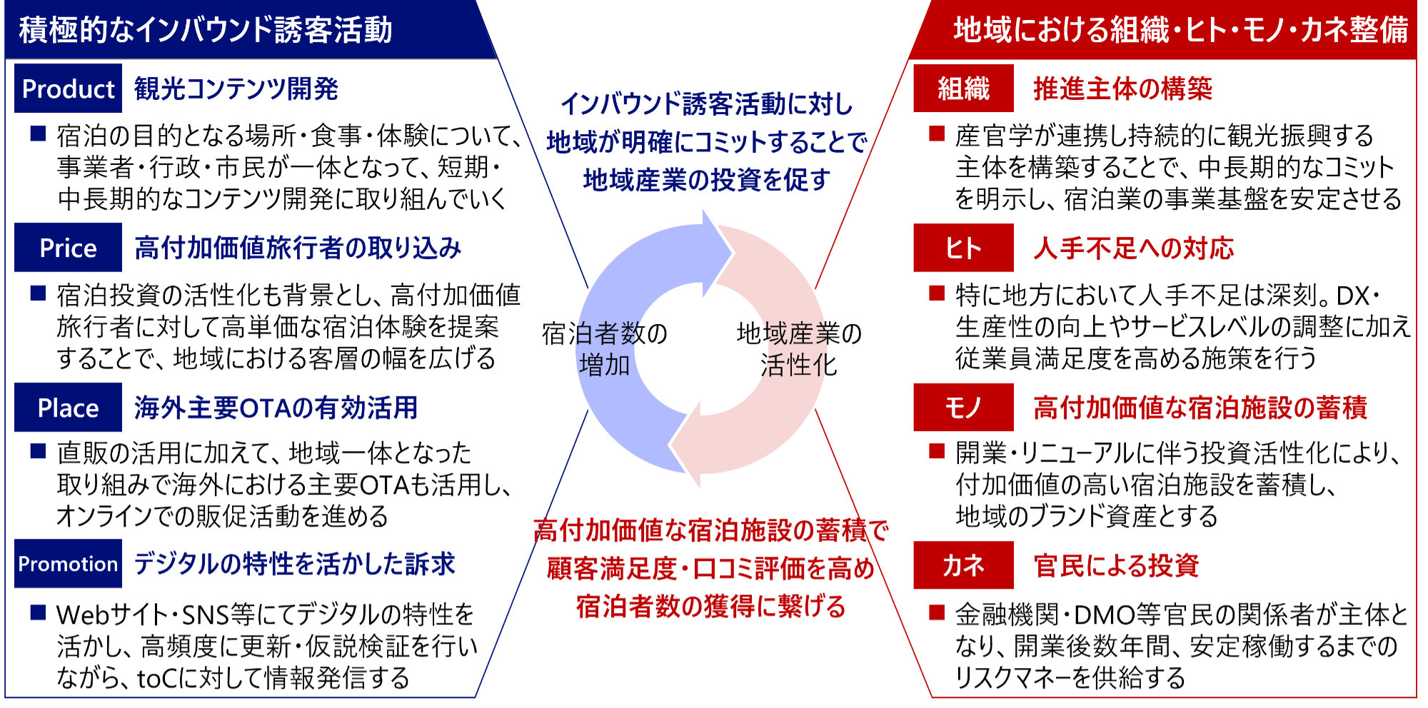 インバウンドの地方誘客には直接的なマーケティング活動のほか、「アゴ・アシ・マクラ(飲食施設・交通手段・宿泊施設)」の充実や、多言語対応等の環境といった訪問者を受け入れる地域としてのインフラの整備が求められる。こうした取り組みの実現には「地域の何がインバウンド誘客の要因たりえるのか」「インバウンド増加が地域に何をもたらすか」というインバウンド誘客の要因と影響の関係を正しく理解することが必要である。