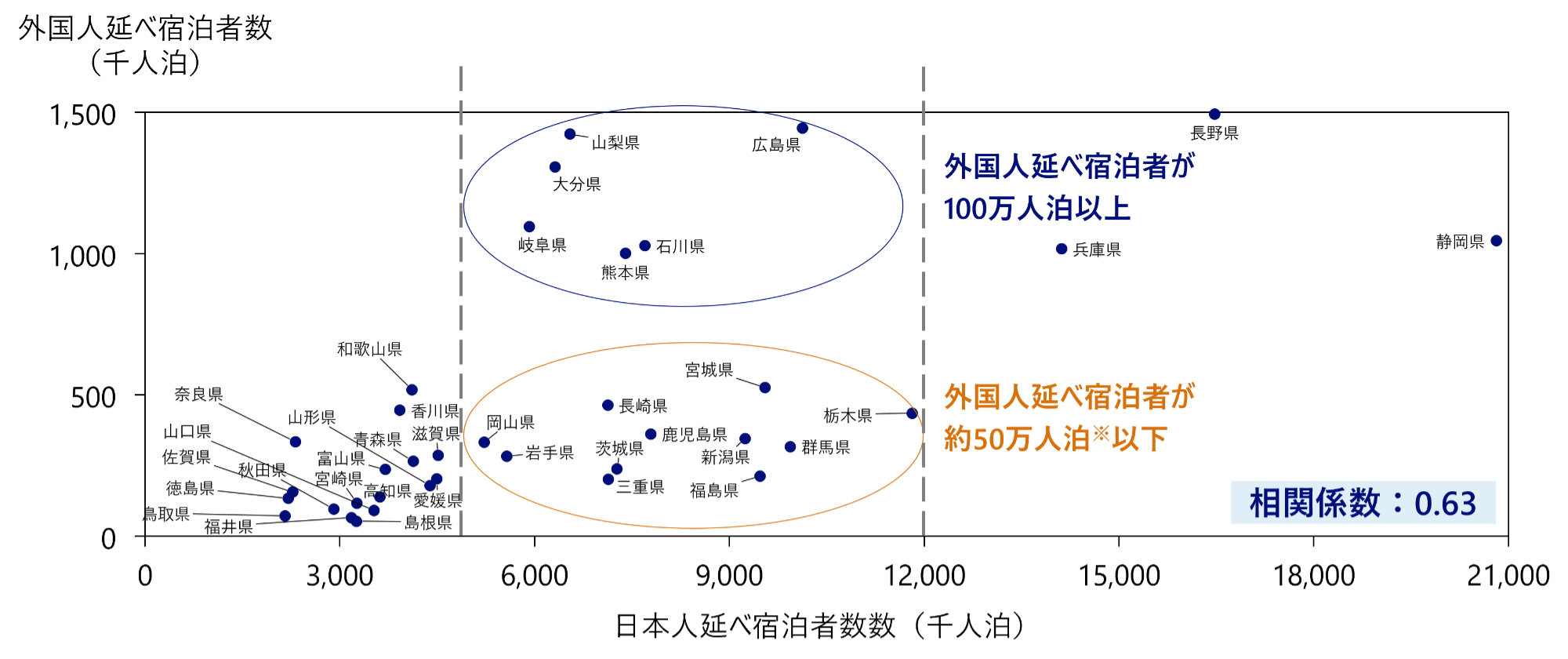 一方で、訪“地方”外国人の分析の観点から、大都市圏および北海道・沖縄県を除いた、日本人延べ宿泊者数が500万人泊~1,200万人泊の17県に着目した。その結果、外国人延べ宿泊者数が100万人泊/年以上の6県(広島県、山梨県、大分県、岐阜県、石川県、熊本県)と50万人泊/年以下の11県(岩手県、宮城県、栃木県、新潟県、福島県、三重県、群馬県、鹿児島県、長崎県、茨城県、岡山県)の二群に大きく分かれていることが分かる。