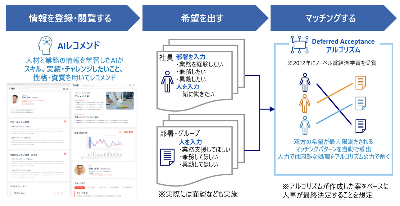 NRIでは、上記のような状況をどのように解決できるかを検証すべく、実証実験を行った。AI(人工知能)をはじめとするテクノロジーの力で人材と業務のマッチングを最適化するTalent Market Place(タレント・マーケットプレイス、以下「TMP」、特許出願中)を開発し、2023年4月から5月にかけ、NRI社内の一つの事業部(約750名所属)における公募制度を対象として実施した。