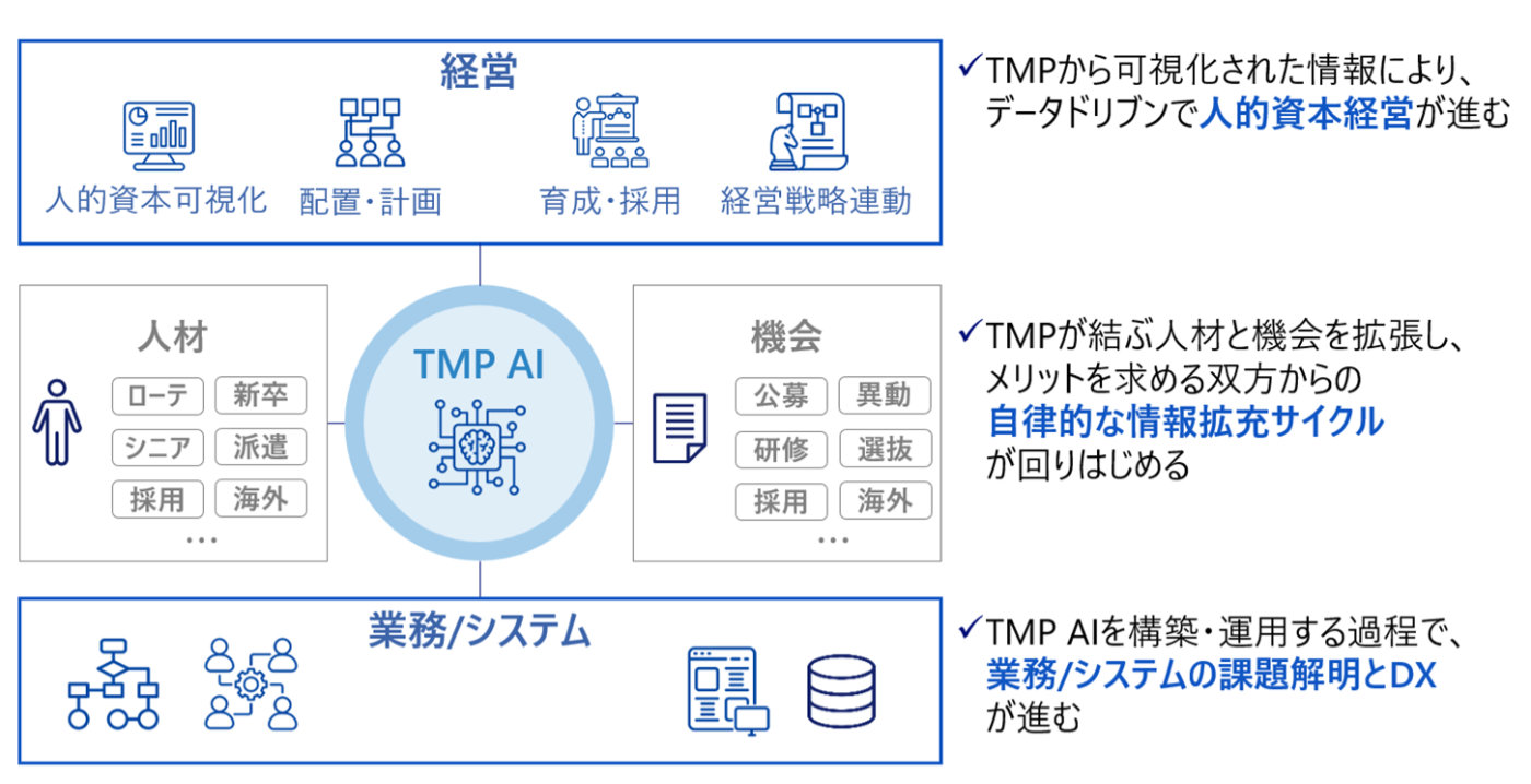 NRIのTMPは、生成AIを活用して企業内の分散した情報を統合・整理し、人事判断に必要なスキル・意向などの重要情報を抽出するテクノロジー(※特許出願中)で、各企業の特徴に応じた人事判断を直接的に支援する生成AIの仕組みを構築し、変革を促すコアとして運用する。さらに、コンサルタント・データサイエンティスト・システムエンジニアが連携し、人事戦略・業務設計から業務・システム改革までを一貫して支援している。