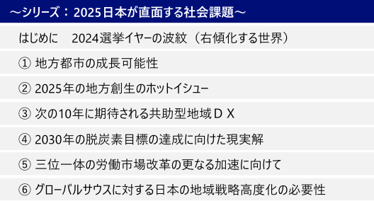 2024年は世界的な選挙イヤーとなり、世界中で既存与党が選挙で大きく敗北し、右傾化が進行した。米国ではトランプ前大統領が再選し、対中国政策の強硬化や国際協力体制への緊張が懸念されている。日本では衆議院において自公が過半数割れとなり、政策決定における交渉が重視されている。2025年は、これらの政治的変化が国際社会に影響を与え、地政学的、経済的リスクが増大し、多国間協力が後退する可能性が懸念される年となるといえよう。こうしたなかでは、私たち一人ひとりがどのように行動し、社会全体がどのように変化を受け入れるかが問われている。特に、日本は団塊世代の全員が後期高齢者となる「真の高齢社会」に突入し、社会保障や労働市場の課題が一層顕在化することが予想される。このような背景認識のもと、「シリーズ:2025日本が直面する社会課題」として、中長期的に取り組むべき社会課題とその解決に向けた政策の方向性を中立的な視点から整理してみることを試みた。本稿は、全6回にわたり連載するシリーズのプロローグである。