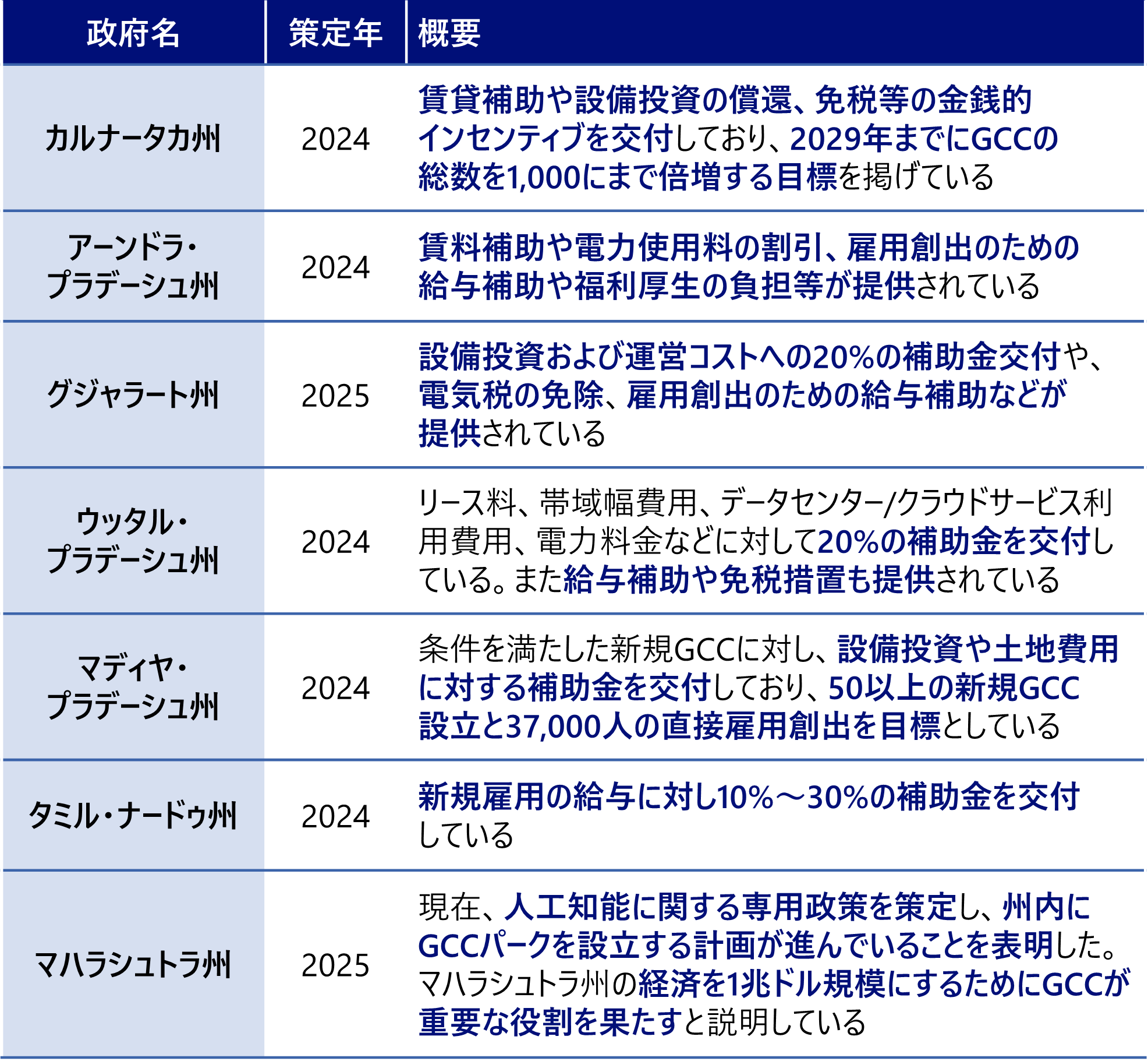 今GCCに注目が集まっている背景には、前項で記載したような製品開発プロセスの変容への対応を各企業が本格化しはじめたことに加え、インド各州が直近1,2年において相次いでGCC誘致施策を打ち出していることが挙げられる。図3は、インド州政府による主なGCC招聘策をまとめたものになる。各州はGCC誘致のため、税制面や人材採用、物件賃貸における補助金等多様なインセンティブ施策を相次ぎ打ち出している。