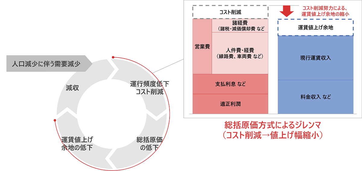 - ※鉄道運賃は総括原価方式で定められており、一定期間(通常3年間)の営業費用や減価償却費、支払利息等に適正利潤を加算した「総括原価」を算出し、その範囲内で運賃を設定しなければならない。