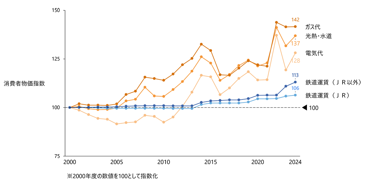 一方で、鉄道事業のように巨額の設備投資の長期回収を要する業態にとっては、借入金利の上昇は重い負担となる。特に直接的な収益に結び付きにくい更新投資や安全投資の資金コストが高まれば、投資の圧縮や先送りが発生し、結果的に事業の安全性やサービスの維持に影響を及ぼす懸念がある。加えて、過去のデフレ期に行われた更新投資の平準化やコスト削減努力により鉄道事業は筋肉質になったが、同時に国の制度上は「事業に必要なコスト」を前提に運賃が認可※されてきたため、長年のコスト圧縮の結果として運賃改定(運賃値上げ)の余地は相対的に小さくなっている。今後はインフレ傾向を前提に、燃料や資材、人件費などの運行費、老朽化対応に伴う修繕費、駅・線路の新設や更新に要する建設費といったコスト上昇が想定される。ゆえに、支出が増加する局面であっても、制度的な制約により運賃でその増分を容易に回収できない構造が続けば、鉄道会社は「支出増を運賃値上げでカバーできない」という深刻なジレンマに直面することになる(図表3)。2000年代以降、他の公共料金は値上げされてきたが、鉄道運賃は総括原価方式による上限運賃の制約により、値上げは限定的であった(図表4)。このように、費用の増加分を価格転嫁できない状況が続けば、鉄道会社を取り巻く事業環境はより一層厳しいものになっていくだろう。