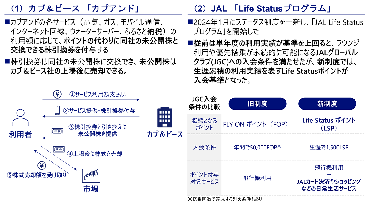 カブ&ピースは、電気、ガス、モバイル通信、インターネット回線、ウォーターサーバー、ふるさと納税といった生活インフラ関連サービスを提供し、サービスの利用者には利用金額に応じて同社の未公開株の引換券を付与している。証券口座の開設は不要で、引換券と交換して得た未公開株は同社が上場後に売却できる制度であり、生活インフラの利用という長期的なお付き合いに加え、株式を上場まで保有するという長期的な関係という長期のサービス利用と長期的な保有に対する期待リターンが高い。また、サービス提供と株式投資を組み合わせることで顧客と株主を一体化し、一般消費者がサービス利用に加えて出資も行い企業のサービスを育てていく循環をつくれている点が特徴的である。