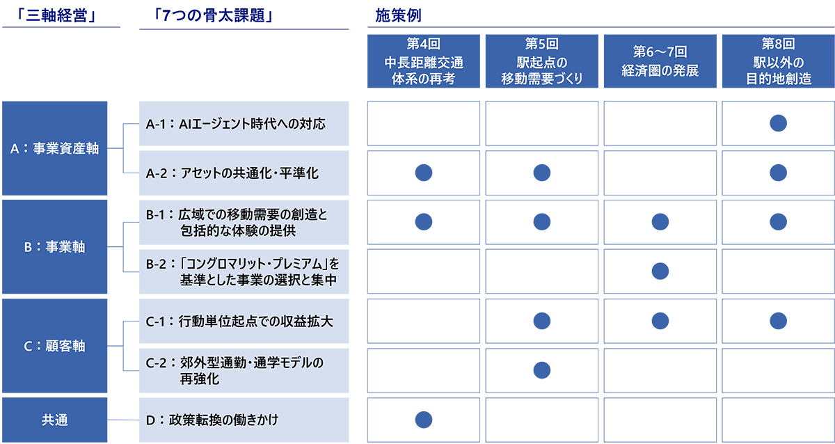 第4回(2040年に向けた中長距離交通体系の課題)から今回までは、「中長距離」・「地方都市」・「非運輸事業」などの切り口で具体的な施策を提言してきたが、これらの施策も「7つの骨太課題」に対応するものとなっている。