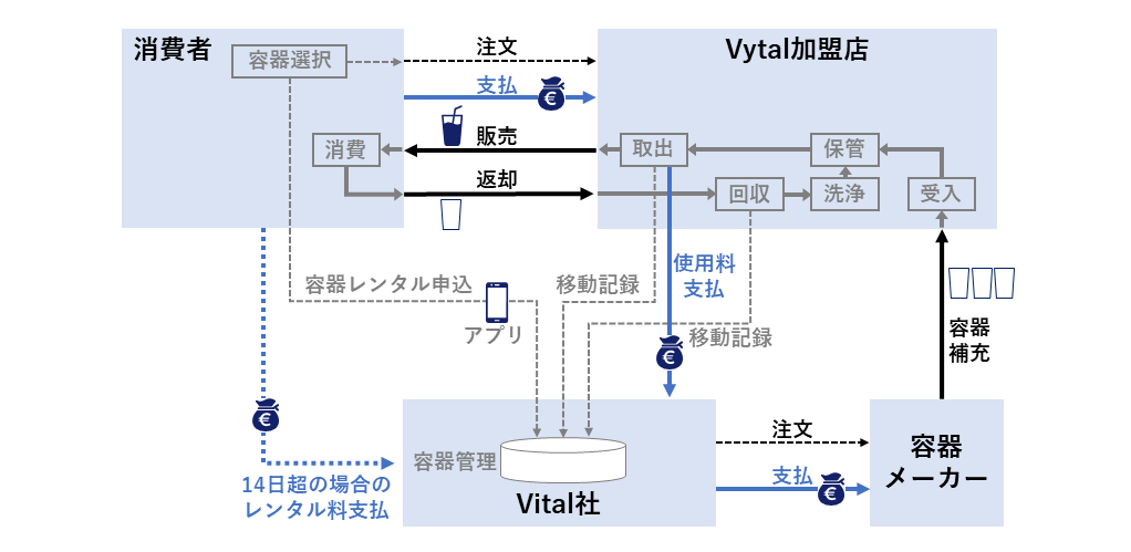 工場から製品を出荷する際には、パレットが使われることが多い。Vytal社が提供するサービスは、そのパレットレンタルのサービスと似ている。その概要をサービスの利用者である消費者とVytal加盟店の立場で説明する(図を参照)。