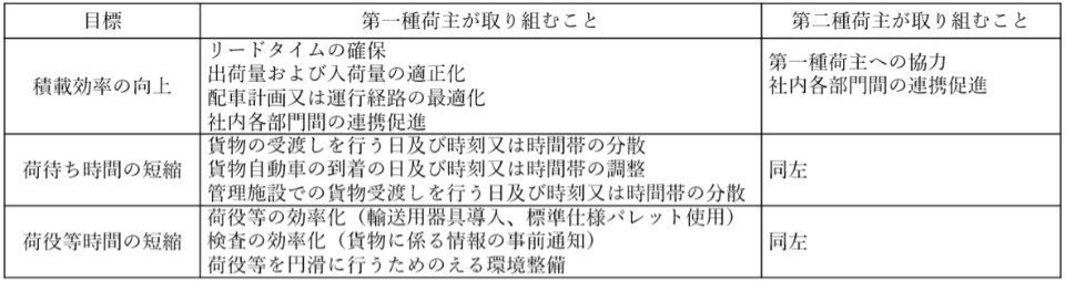 まず、「すべての荷主」に、物流効率化のために取り組むべき措置について努力義務が課される。この努力義務は発荷主と着荷主の双方が対象だ。努力が求められることは表1に示すとおりである。