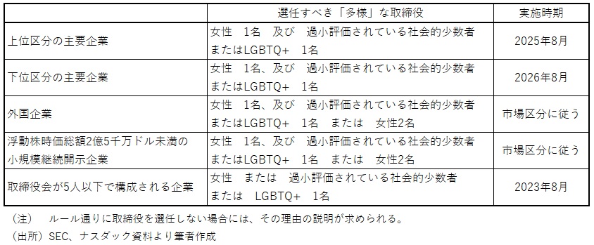すなわち、ナスダックの主要上場企業に対して、取締役会メンバーの2名以上を「多様(Diverse)」とされる要件を満たす者から選任するよう求める。「多様」とされる取締役会メンバーのうち1名は女性であると自認する個人、もう1名は、過小評価されている社会的少数者(underrepresented minority)またはLGBTQ+であると自認する個人でなければならず、2名以上の「多様」な取締役を選任していない企業は、その理由を説明しなければならない(規則5605(f)(2))。