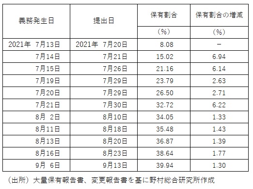 (注4)この規定は、2019年の証券法改正で新たに設けられたものである。また、同改正前は、直近の開示から5%以上の増減が生じた場合の開示については、3日以内に開示し、それまでの間および開示後2日間は追加的な取得または処分を禁じる内容となっていた(2014年証券法86条2項)