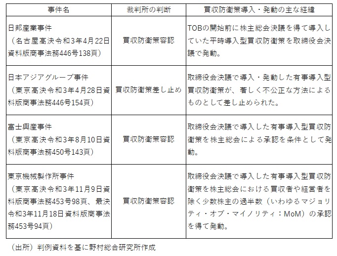 図表 1 2021 年の買収防衛策をめぐる主要な司法判断