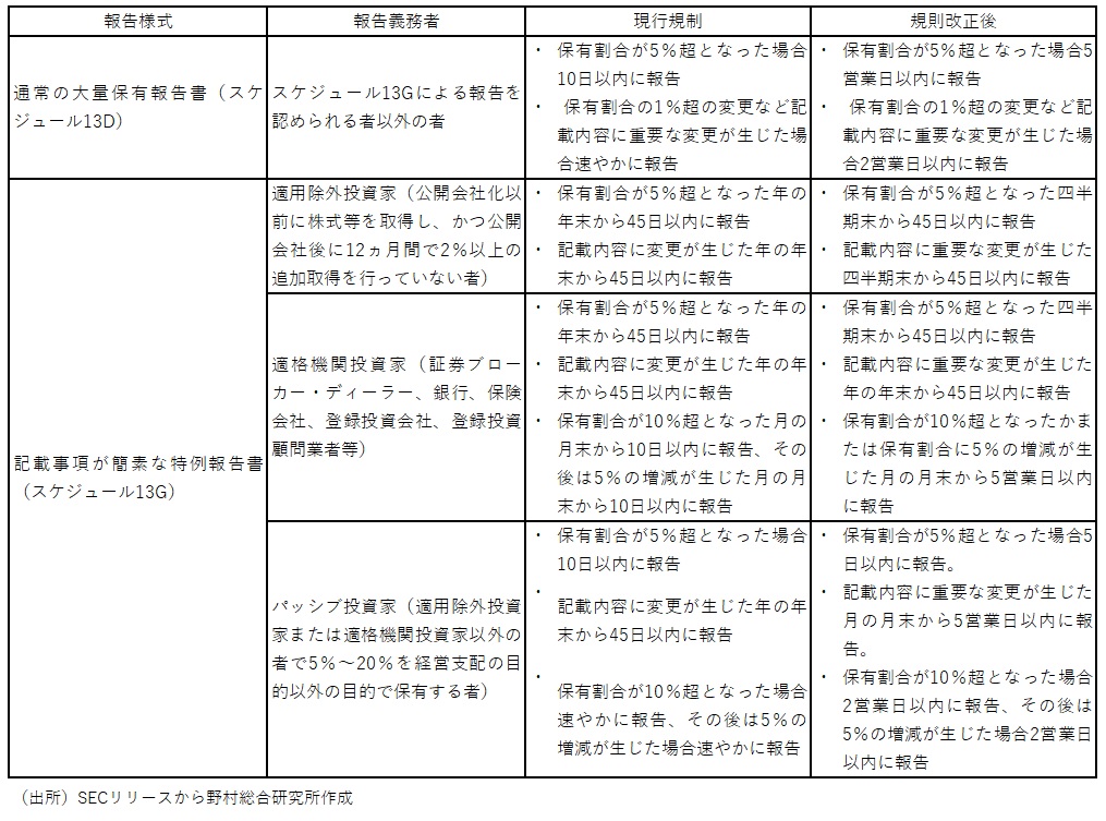 - 通常の大量保有報告書の提出期限が、改正案の保有割合が5%超となった時点から「5日以内」ではなく「5営業日以内」とされた。なお、改正提案の当初から、大量保有報告書の提出期限短縮がアクティビスト株主による株式の買い集めを困難にし、株主アクティビズムの後退を招くという批判があったが、SECは、「5営業日以内」であれば、アクティビスト株主による買い集め目標量の90~100%を買付けることが可能だとし、アクティビズムへのネガティブな影響はないと主張している。
