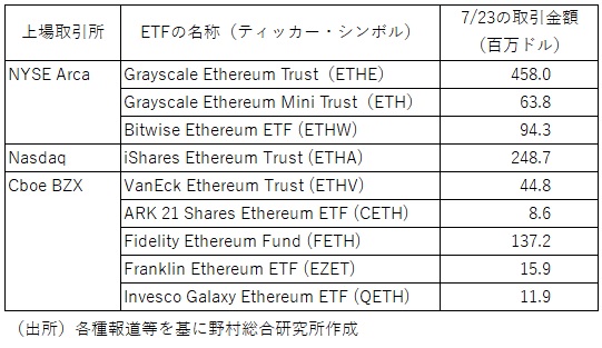 2024年7月23日、米国の3つの証券取引所で、暗号資産イーサ(ETH)の現物を裏付け資産とする上場投資信託(ETF)9銘柄の取引が開始された。2024年1月に取引を開始したビットコイン(BTC)現物ETFに続く、2種類目の米国市場で取引される暗号資産現物ETFである。初日の売買高は、46.6億ドルを記録したBTC現物ETFには及ばなかったものの、累計で約10.8億ドルに達した。