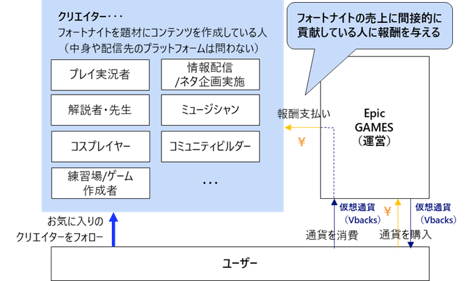 3.5億人というフォートナイトの驚異的なプレイヤー数の裏には、プレイ実況者やコスプレイヤー、最新情報の解説者、練習場の運営者といったユーザに近いところで啓もう活動をしているクリエイターが存在します。こうしたクリエイターは、従来はコンテンツに広告を掲載することをモチベーションにしていましたが、これはゆがんだ収益モデルです。本来はフォートナイトの魅力を発信することが、どの程度ユーザー増加・維持に貢献しているかの価値に応じた対価を得るべきです。