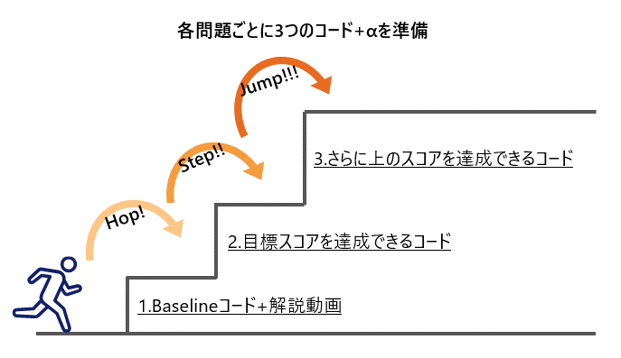 - 「さらに上のスコアを達成できるコード」は、コンペ上位者の解法を組み込んだコードであり、問題集に取り組んだ後に確認するものです。コンペ上位者の解法を学ぶことで、エキスパートの視点を学び、分析における引き出しを増やしてほしいと考えております。