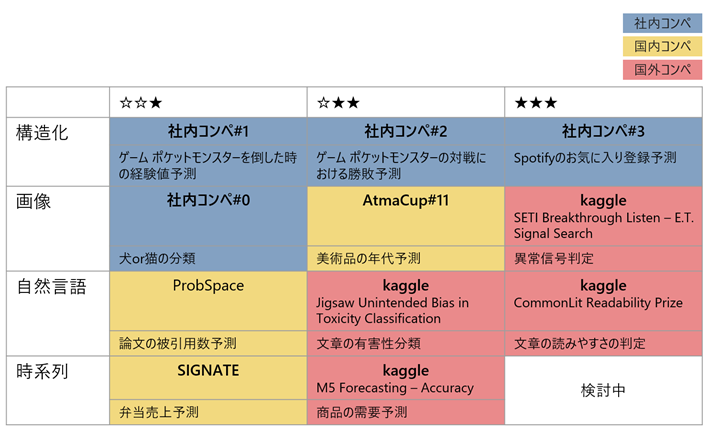 NRIシステムコンサルティング事業本部では、データサイエンティストを業務で通用するレベルに育成するために、様々な取り組みを行っています。前回ご紹介した社内コンペティションもそのひとつですが、より多くの学習機会を提供するため、外部のコンペティションも活用しています。具体的には、以前開催されたコンペティションの問題をデータ種別×レベル別に整理し、以下の表のような形で問題集を作成しております。このように整理することで、社員が取り組みたい問題や早く身に着けたいスキルから優先的に取り組めるような内容をサポートしており、データサイエンススキルアッププログラムとして社内に提供しております。