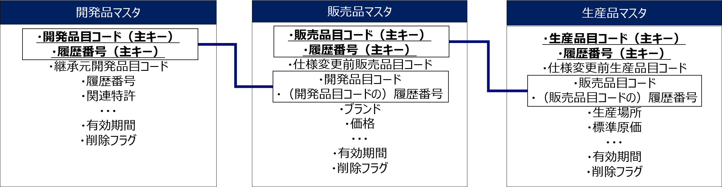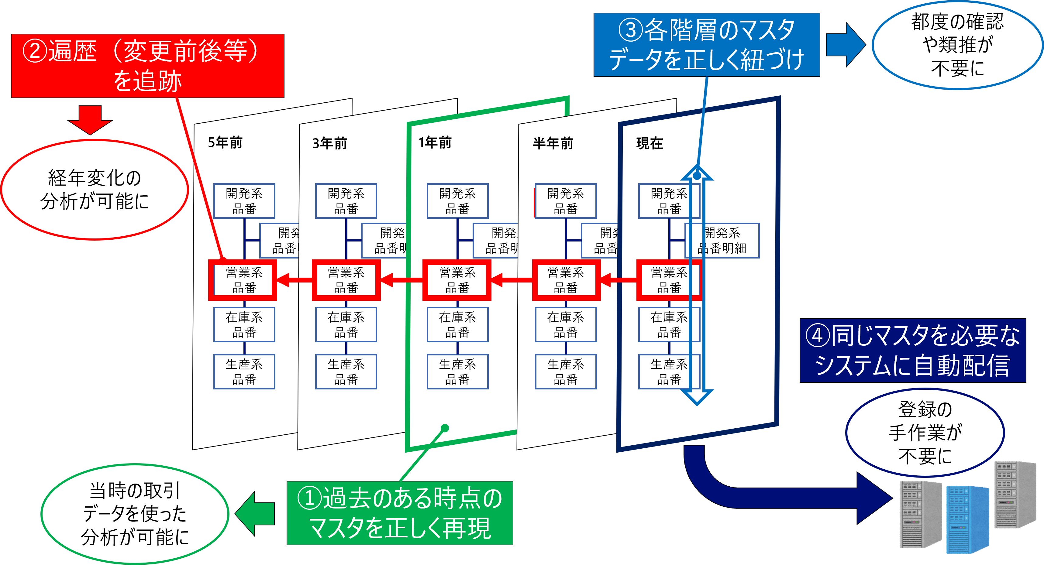 マスターデータの遍歴(製品であれば、例えば仕様変更前の製品コードと仕様変更後の製品コードのつながり)を時系列にしたがって「自動的に」追えるようにすることです。製品・取引先コードの遍歴を追跡することで、複数のコードを同一の製品・取引先グループとして分析できます。 -