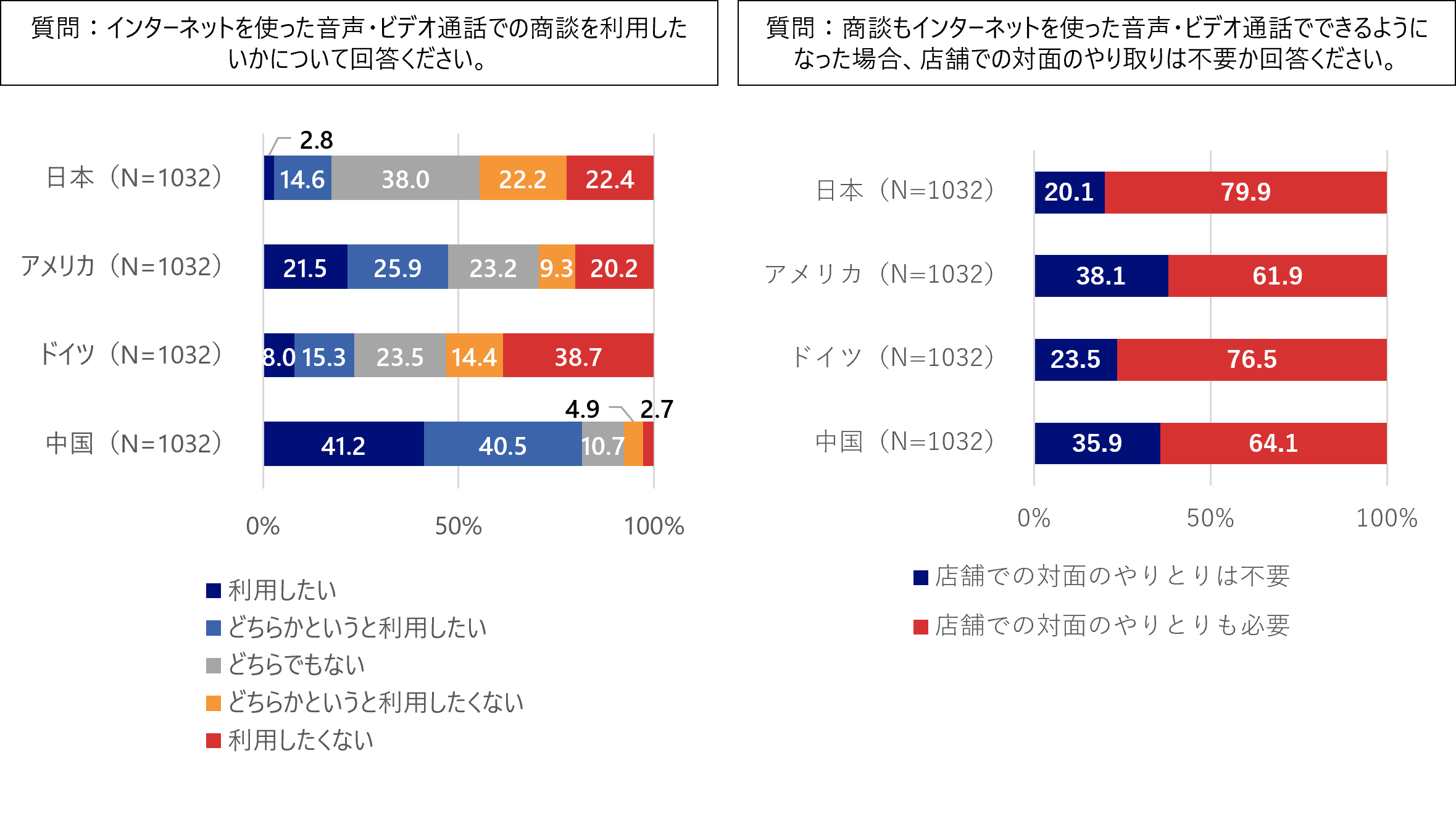 さらに、インターネット商談があれば「店舗での対面のやりとりが不要」と回答した人は、どの国でも4割を下回りました。インターネット商談を「利用したい」割合が高い中国でも、64.1%が「店舗での対面のやりとりも必要」と答えており(図1右)、インターネット商談は対面商談に完全に置き換わるものではなく、両方が補完しあう手段として求められています。