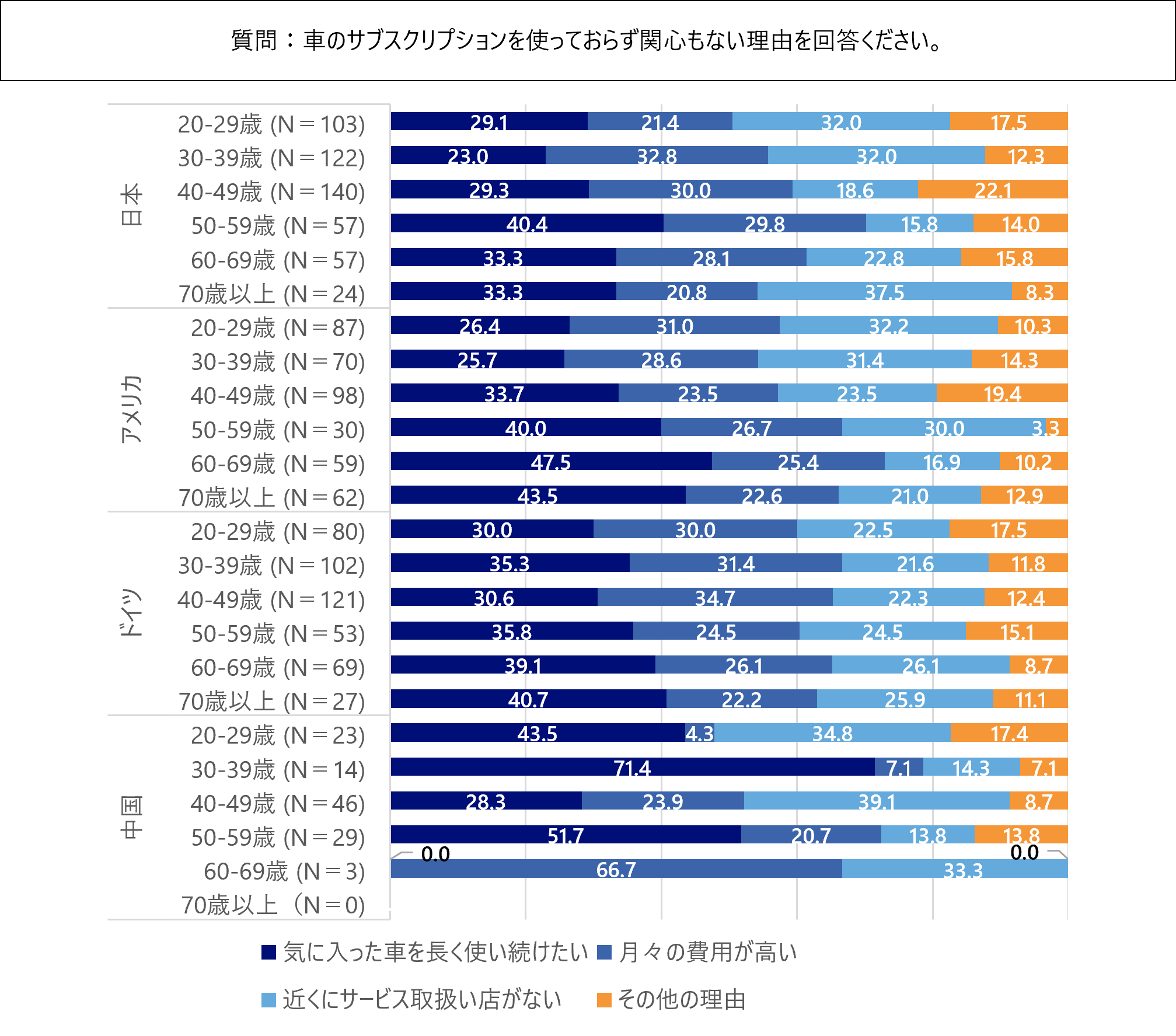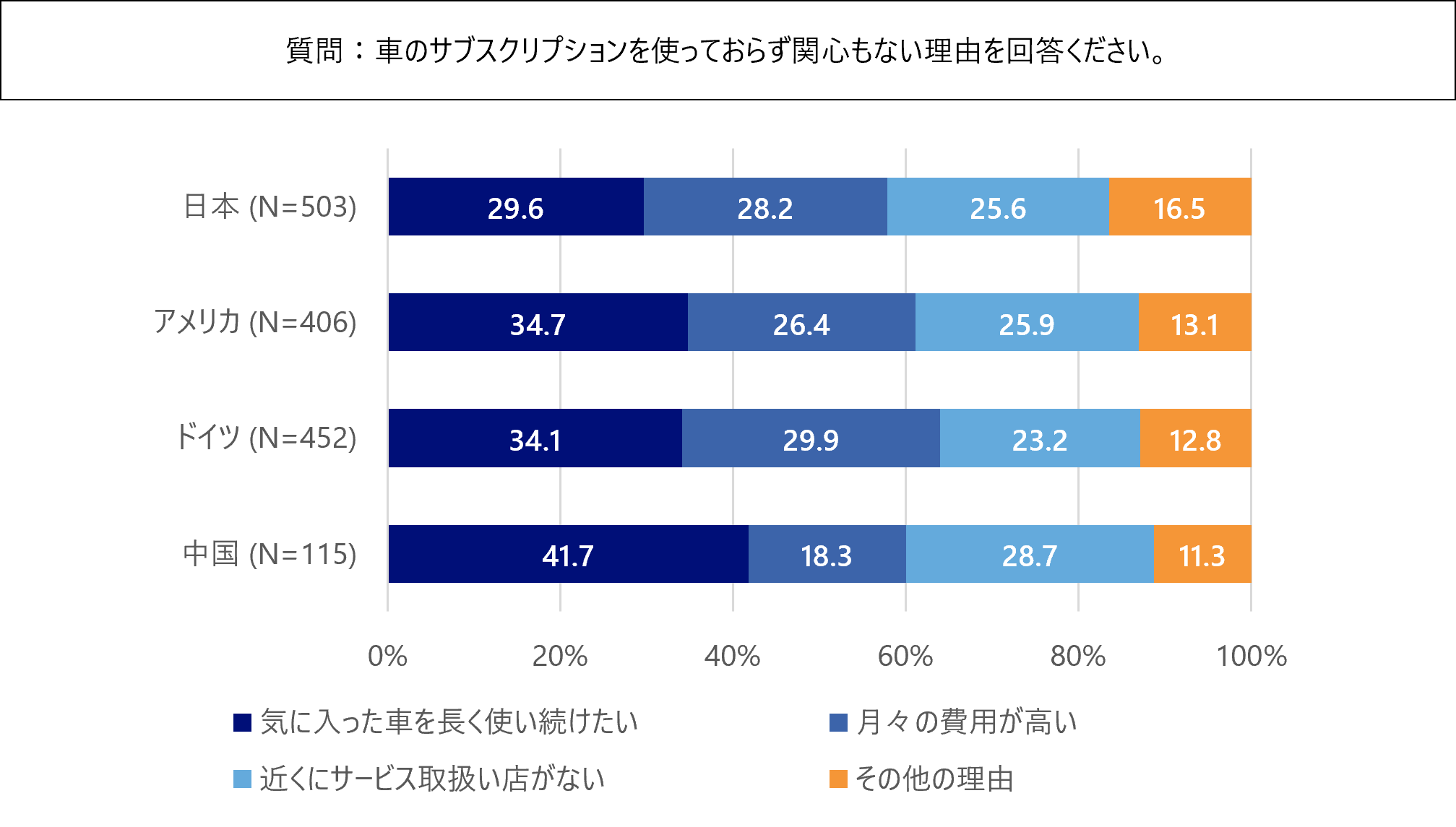 サブスクリプションを利用したことがなく関心もない理由としては、「気に入った車を長く使い続けたい」という回答がどの国においても最も多く、日本29.6%、アメリカ34.7%、ドイツ34.1%、中国41.7%となりました(図5)。