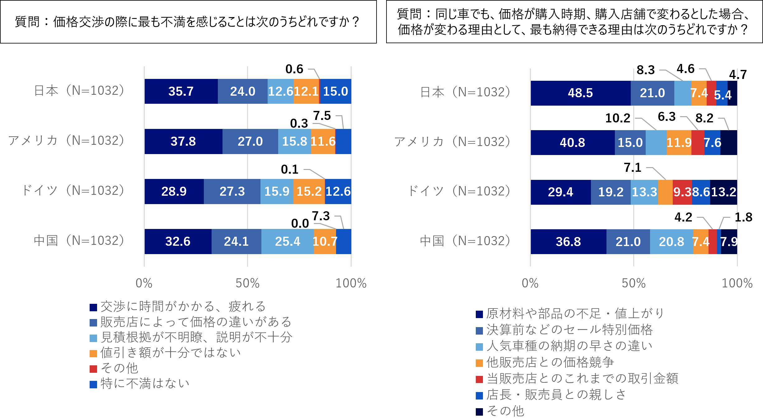 価格交渉に関する不満について尋ねたところ、いずれの国でも「交渉に時間がかかる、疲れる」と回答した人の割合が最も多く(日:35.7%、米:37.8%、独:28.9%、中:32.6%)、さらに日本・アメリカ・ドイツでは、「販売店によって価格の違いがある」、「見積根拠が不明瞭、説明が不十分」が続きました。中国では、「見積根拠が不明瞭、説明が不十分(25.4%)」と「販売店によって価格の違いがある(24.1%)」が同程度で、他の国よりも価格設定の透明性に対する不満が高いことがわかりました(図3左)。