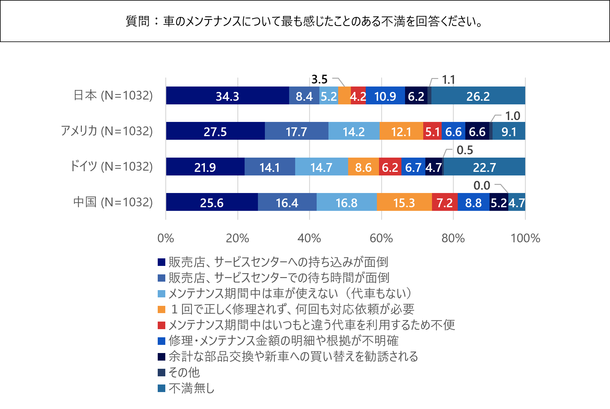 メンテナンスに対して何らかの不満を持っている人は、日本73.8%、アメリカ90.8%、ドイツ77.4%、中国95.3%となり、どの国でも7割を超えています(図9)。最も多かった不満の理由は「販売店、サービスセンターへの持ち込みが面倒」であり、日本34.3%、アメリカ27.5%、ドイツ21.9%、中国25.6%でした(図9)。アメリカ、ドイツ、中国においては「販売店、サービスセンターでの待ち時間が面倒」、「メンテナンス期間中は車が使えない(代車もない)」の選択肢もTOP3に選ばれています(図9)。
