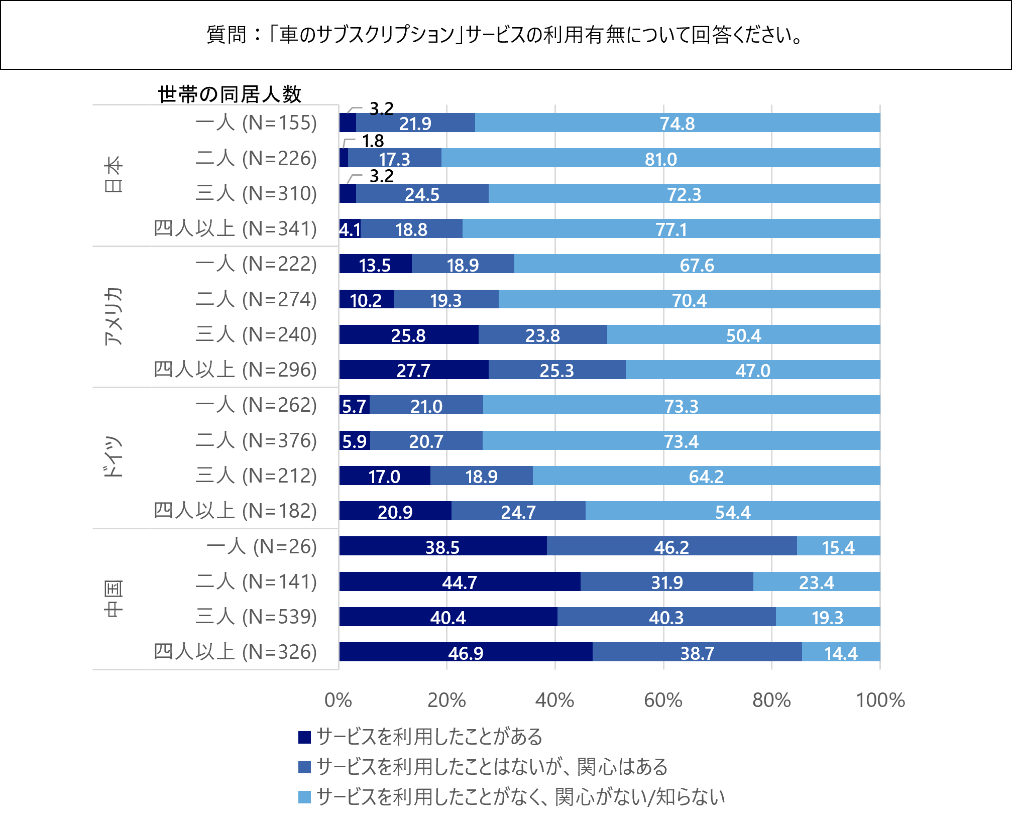 また、サブスクリプションの利用者の属性情報を見ると、米独では同居人数が多い人ほど、サブスクの利用意向が高い傾向にあることが分かりました(図7)。