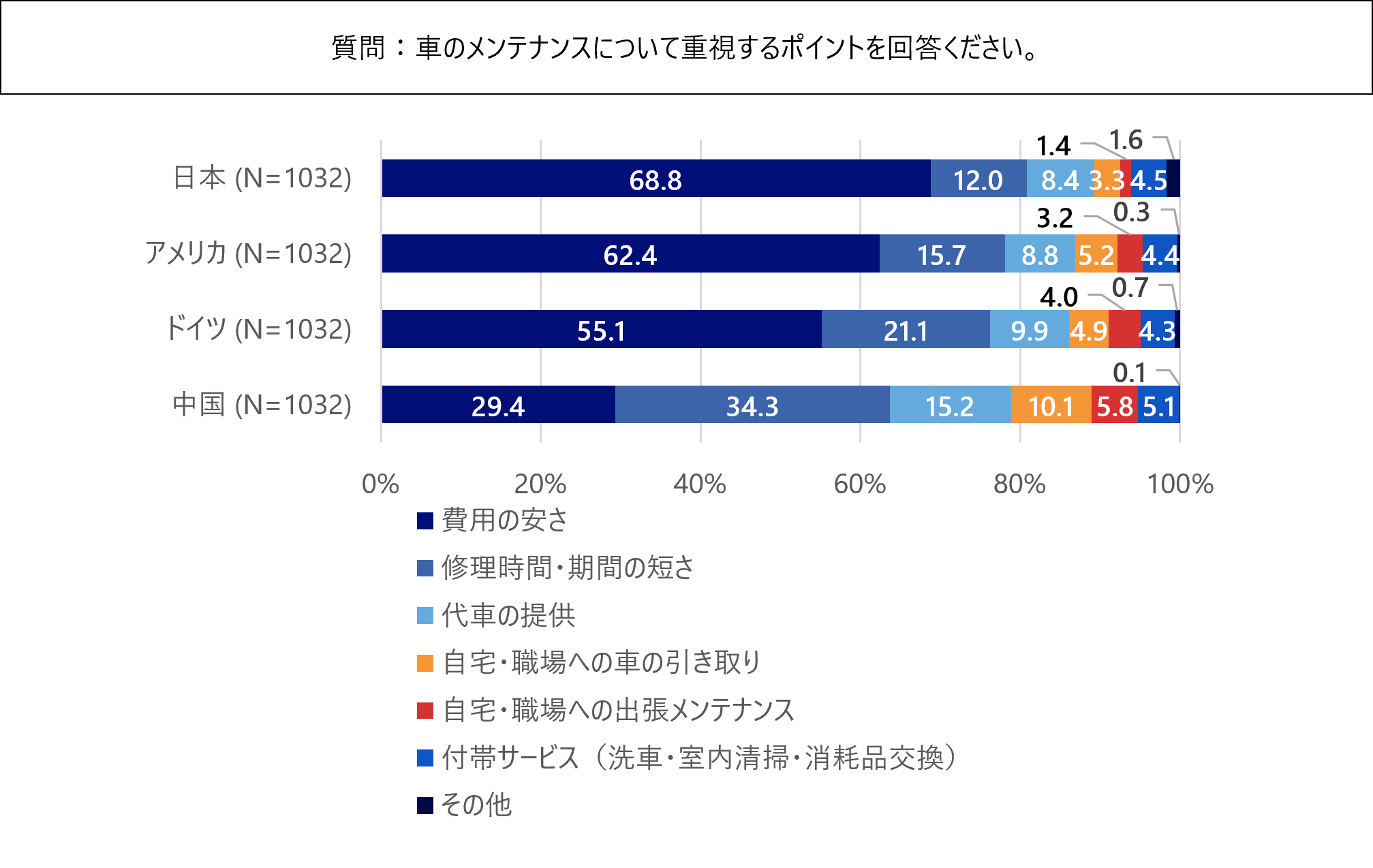 メンテナンスについて最重視するポイントは、日本、アメリカ、ドイツでは「費用の安さ」となりました。例外的に、中国では「修理時間・期間の短さ」という結果となっています(図10)。