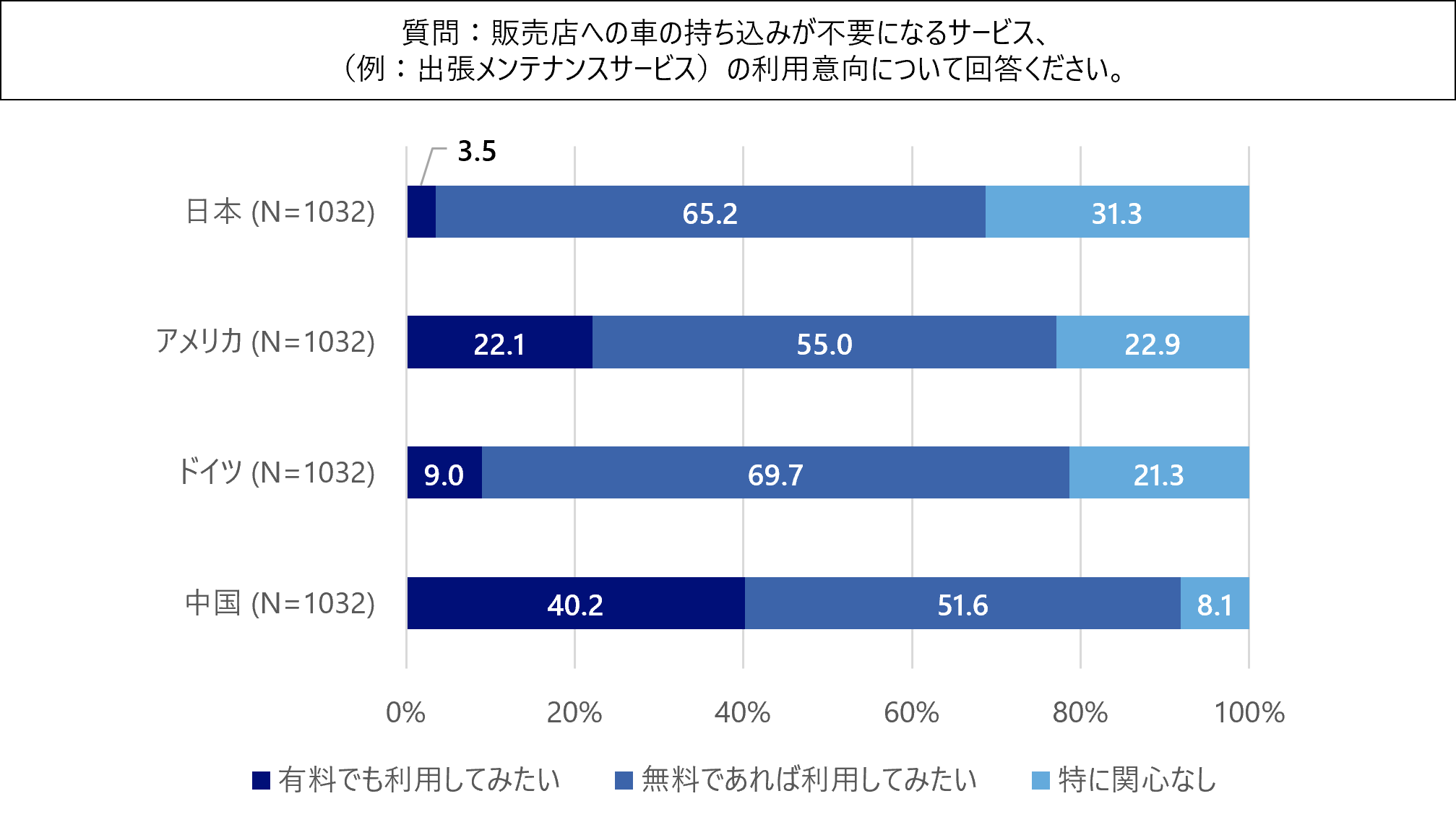 また、メンテナンスの不満に対する打ち手である出張メンテナンスサービスに対して、「有料でも利用してみたい」と回答した人は、中国で最も高く40.2%でした。他の国では日本3.5%、アメリカ22.1%、ドイツ9.0%となっており、特に日本、ドイツの追加支払い意向は低い結果となりました(図11)。中国での追加支払い意向が高い理由としては、車両メンテナンスで重要視するポイントが、中国のみ「費用」ではなく「修理時間・期間の短さ」となっていたことが関係していると考えられます。