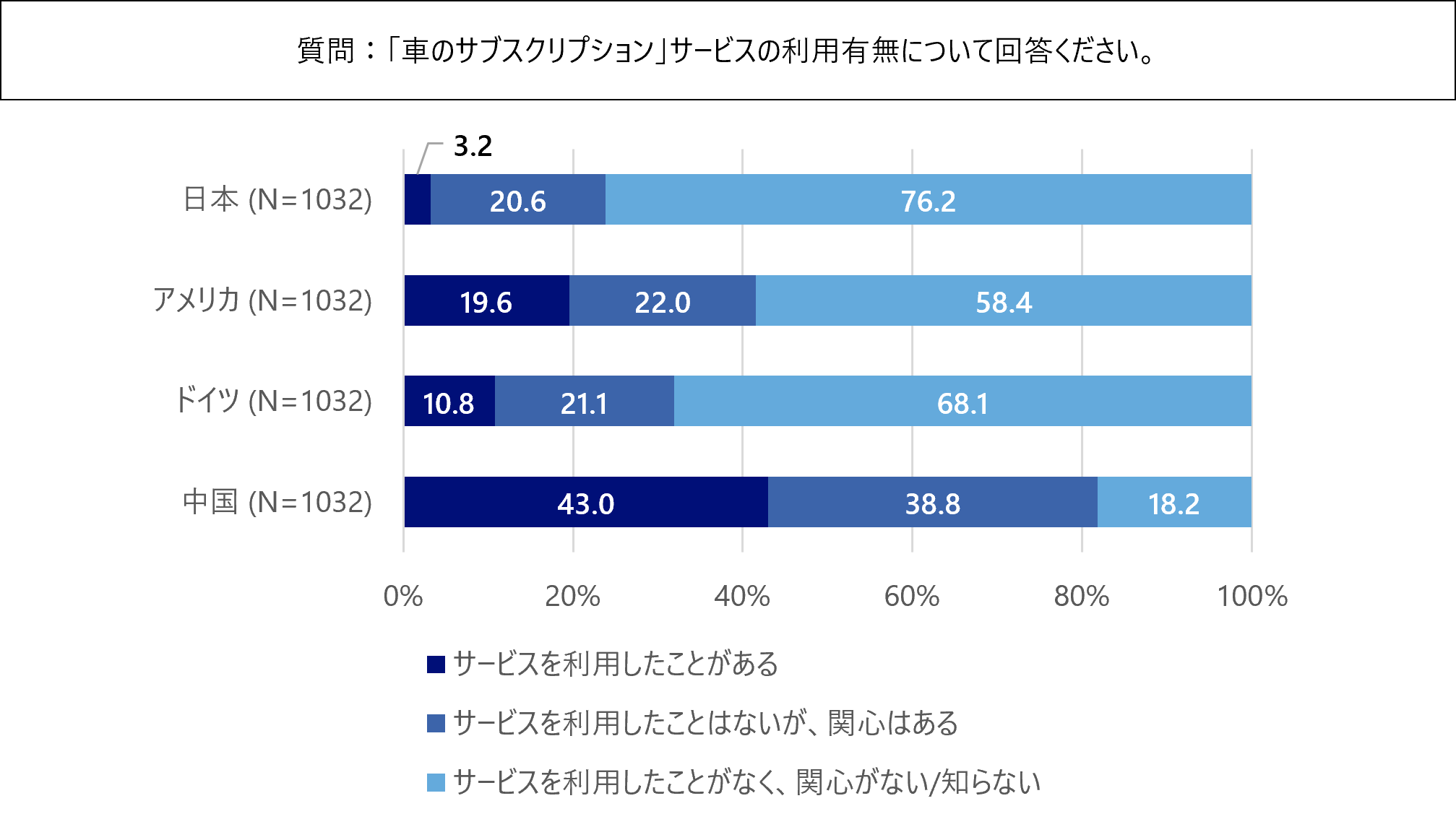 自動車保有者の車のサブスクリプション利用経験者の割合は、日本3.2%、アメリカ19.6%、ドイツ10.8%と少数でした。しかし、例外として中国では43.0%という高い割合となりました(図4)。