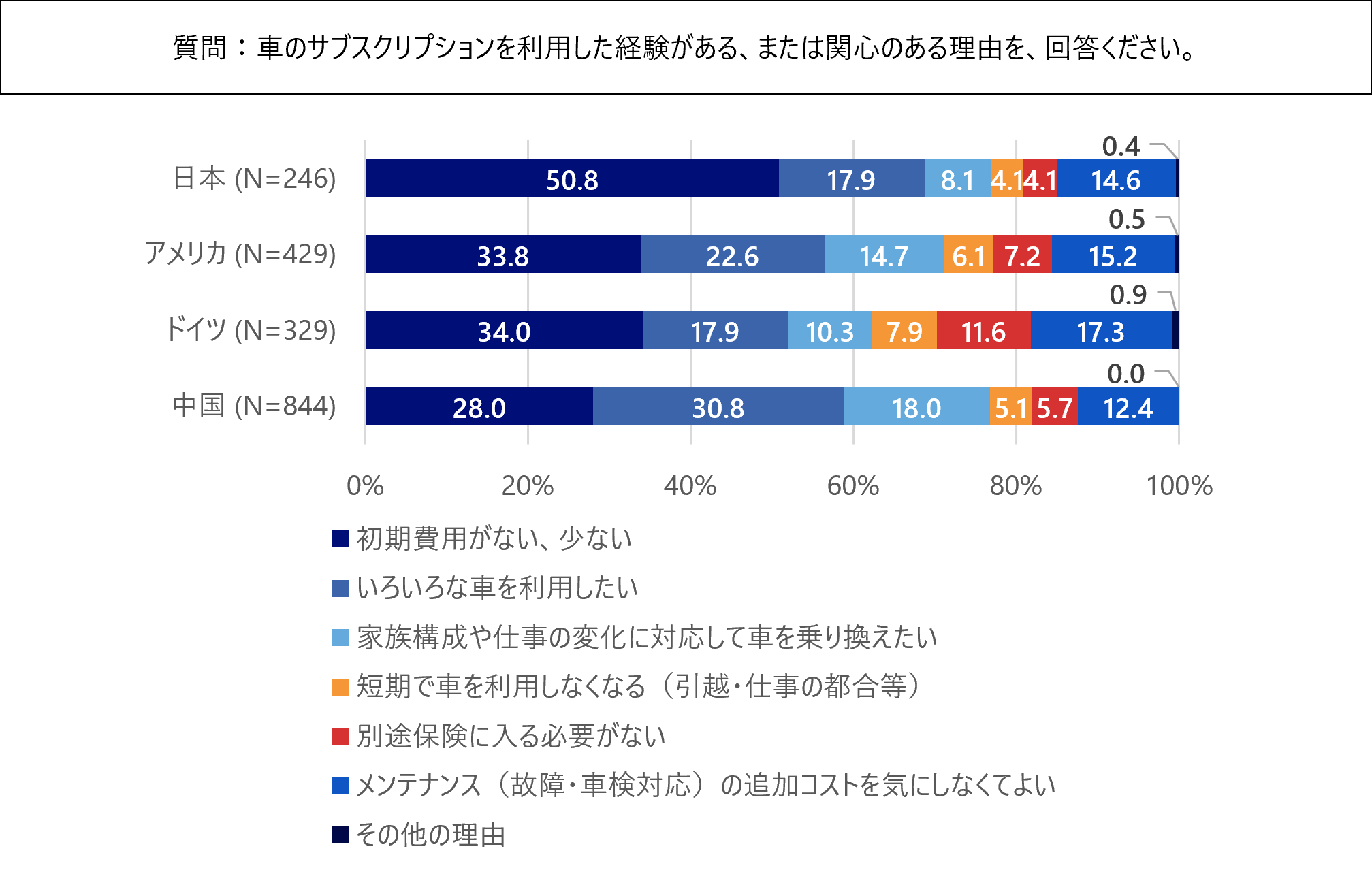 加えて、サブスクリプション利用経験者に対し利用目的を尋ねると、サブスクリプションの利用経験が最も多い中国では「いろいろな車を利用したい」という回答が最多となりました(図8)。