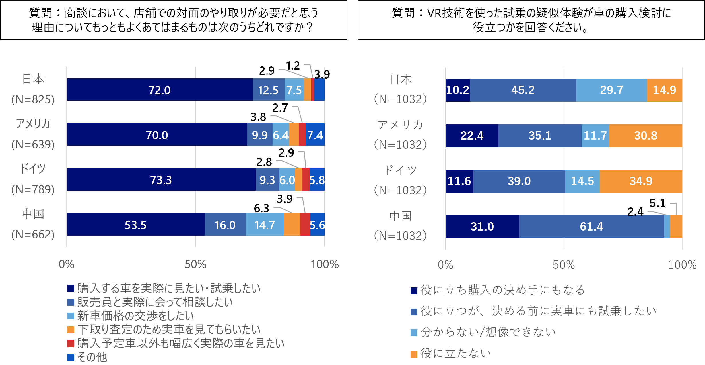 商談において店舗での対面のやり取りが必要だと思う理由については、いずれの国でも「購入する車を実際に見たい・試乗したい」を挙げた回答者が最も多く、日本で72.0%、ドイツで73.3%、アメリカで70.0%、中国で53.5%に達しました(図2左)。