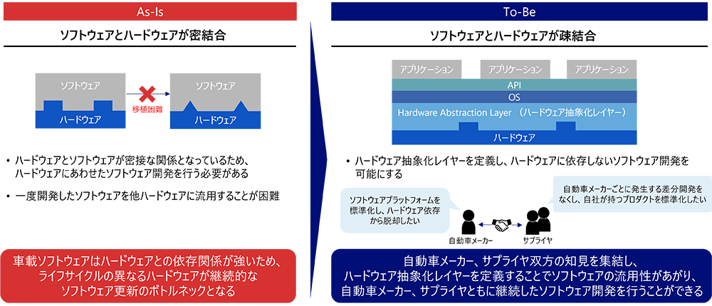 この対策としては、サプライヤと対等なパートナーシップを結び、内製と外製が共生する構造への変革が肝要だと考えます。例えば、自動車メーカー、サプライヤ双方の知見を集結し、ハードウェア抽象化レイヤを定義することでソフトウェアの流用性を高め、自動車メーカー、サプライヤともに継続したソフトウェア開発を行うことは有効な対策となりえます(図1)。これにより自動車メーカー側はソフトウェアプラットフォームの標準化によるハードウェア依存からの脱却が可能となり、サプライヤ側も自動車メーカーごとに発生する差分開発から解放され、自社が持つプロダクトを標準化できるという、ギブアンドテイクの関係を構築できます。かつては自動車産業はすり合わせ型の代表と言われていましたが、PC産業と同じようにモジュール化が進むと考えられます。