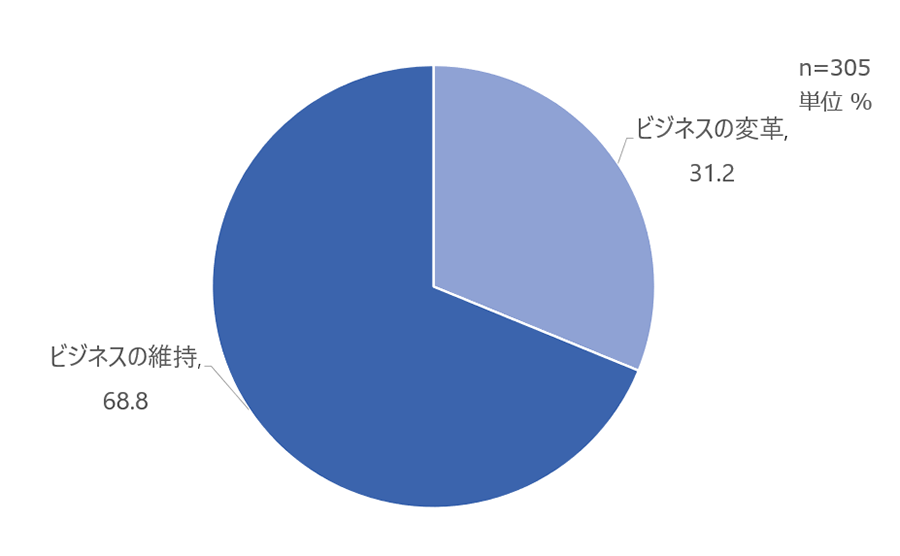 調査では、IT費用の支出の目的を「ビジネスの変革」と「ビジネスの維持」にわけてその配分を尋ねています。ビジネスの変革に向けた支出は、商品・サービスの品質や提供スピードの向上などへの投資で、ビジネスの維持に対する支出は、法制度変更への対応、維持管理・運用、業務量増加に伴う増強、セキュリティ向上などにかかるコストです。回答者が答えた数値の平均をとると、IT費用の配分は、ビジネスの変革が31.2%、ビジネスの維持が68.8%という結果になりました。