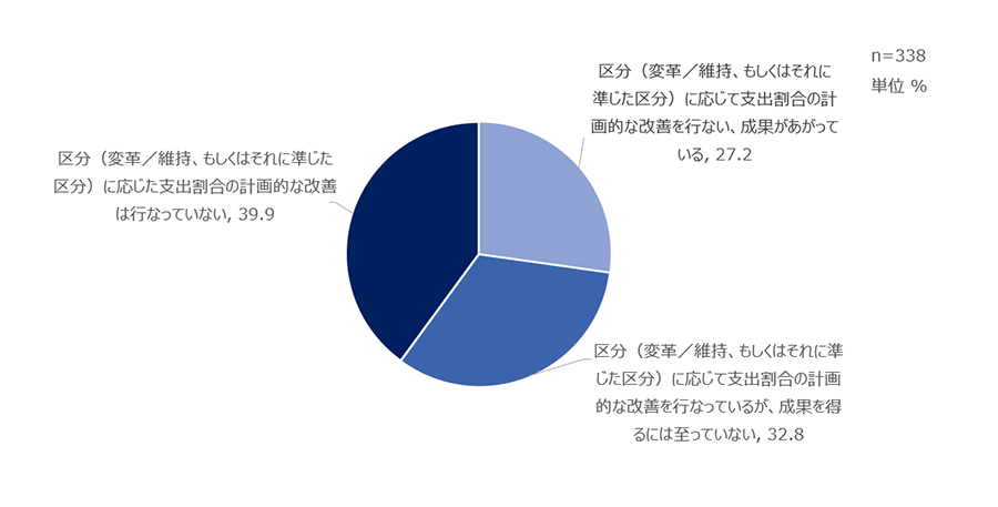 さらに、支出割合の区分(ビジネスの変革/ビジネスの維持、もしくはそれに準じた区分)について適切な割合で振り分けるような改善を行なっているか尋ねたところ、「計画的な改善を行ない、成果があがっている」と答えた企業は全体の27.2%、「計画的な改善を行なっているが、成果を得るには至っていない」と答えた企業は32.8%であり、約60%の企業が計画的な改善を行なっていることがわかります。(図2)