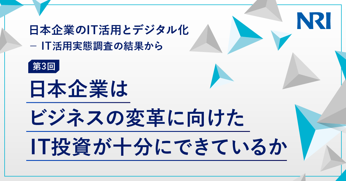 株式会社野村総合研究所では、2003年より毎年、売上高上位の国内企業約3000社を対象に「 ユーザ企業のIT活用実態調査 」を実施しています。この連載では、最新の調査から、いくつかの設問をピックアップして集計結果をご紹介します。日本企業のIT活用動向を知るとともに、自社のデジタル化および情報化の戦略を考える一助としてご活用ください。