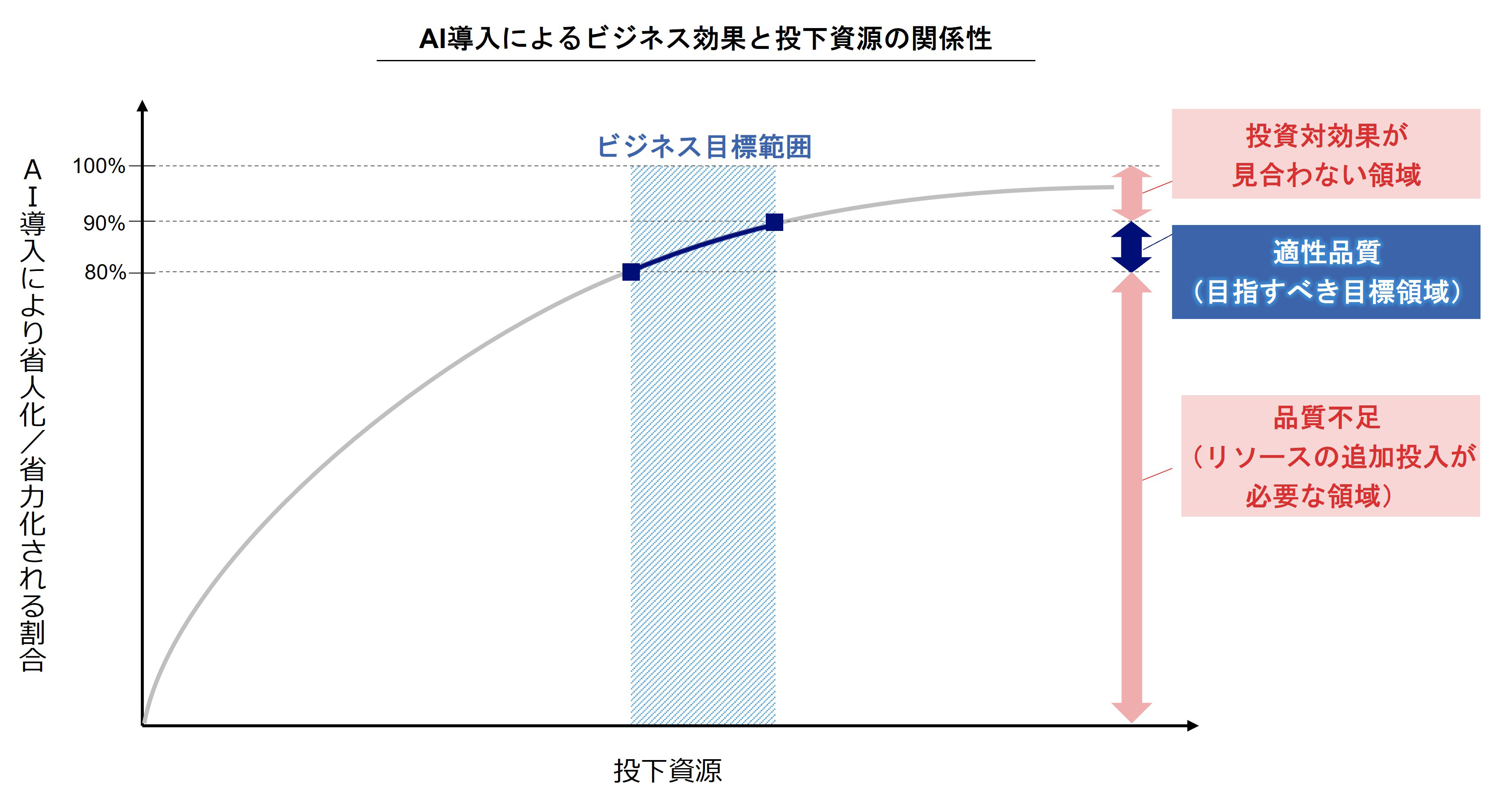 AIには「不確実性」があるので、実際にやってみないと、どのくらいの費用をかければどの程度の効果が出るのかがわからないという面があります。一般的に、AIの精度が向上するにつれて、それを高めるために必要な費用や労力(投下資源)は増えていき、割に合わなくなってくる傾向があります。そのため、100%の精度を目指すのではなく、合理的な目標を設定すべきです。そうしないと、やめどきを見失ってしまいます。
