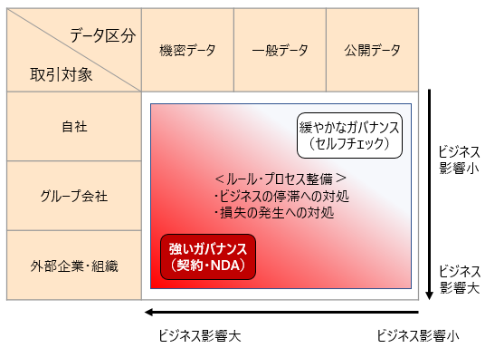 データ取引の際は、自社内の他部門、グループ会社、外部企業・組織の順でガバナンスを強化する必要があります。例えば、自社内であれば個々の担当者が簡易セルフチェックを通じて確認すれば十分であると見なされるかもしれませんが、外部企業・組織との取引の際には契約書による法的効力の確保、交渉窓口の統一、過去の取引内容を踏まえた取引条件の交渉などが必要になるでしょう。もし既にこうした取り組みを行っている企業とのデータ取引が必要となった場合、自社も同等程度のガバナンスを確立した上で取引に臨む必要があります。