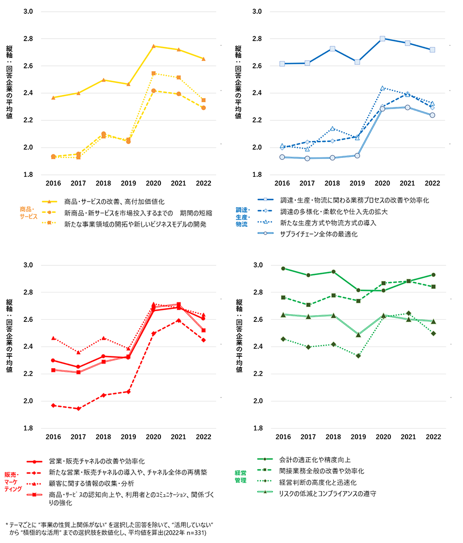 本調査では、2016年から継続して、IT活用の取り組み状況をテーマごとに4段階評価で尋ねています。図1は、テーマごとの平均値(以下、IT活用度)とその変化を示しています。また、この図では、IT活用のテーマを商品・サービス(黄)、調達・生産・物流(青)、販売・マーケティング(赤)、経営管理(緑)の4つの領域に分類しています。