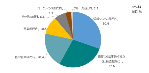 次に、デジタル化推進部門が「ある」と答えた企業を対象として、デジタル化推進部門がどの組織に所属しているかをたずねました。その結果、情報システム部門内と答えた企業が30.4%と最も多く、続いて、既存の他部門から独立(社長直轄など)が27.6%、経営企画部門内が20.4%、事業部門内が10.5%でした(図2)。