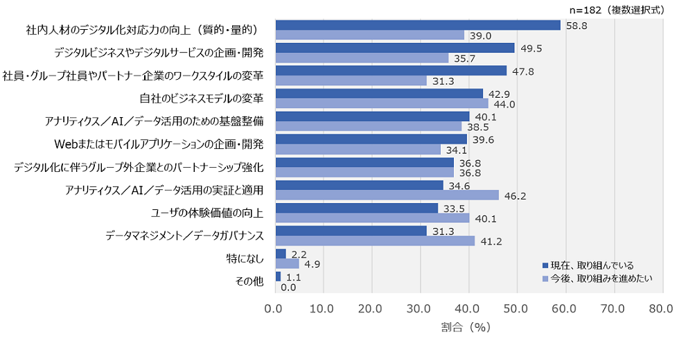 本調査では、各社のデジタル化推進部門に対し、「現在、取り組んでいる課題」と「今後、取り組みを進めたい課題」を尋ねています。(図1)
