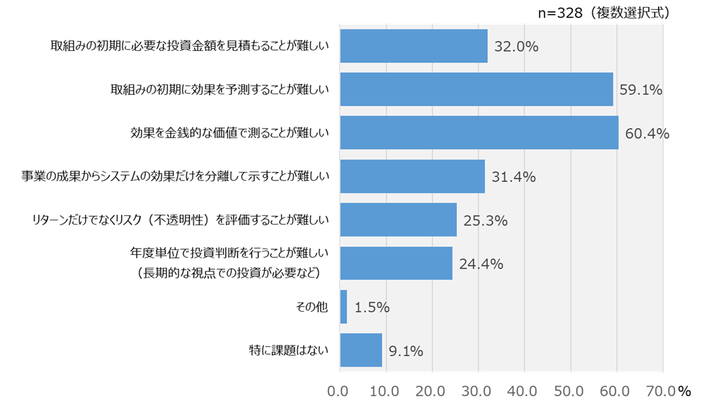 調査の結果、約6割の企業が「取組みの初期に効果を予測すること」、「効果を金銭的な価値で測ること」の難しさを課題として挙げています。(図1)