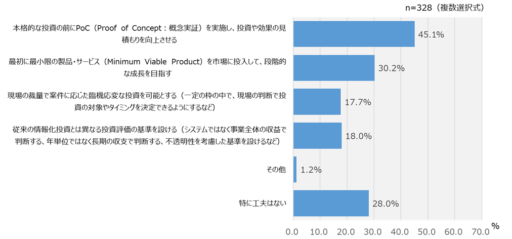 また、デジタル化投資の判断において工夫していることを尋ねたところ、「本格的な投資の前にPoCを実施し、投資や効果の見積もりを向上させる」と答えた企業が45.1%、次いで「最初に最小限の製品・サービス(Minimum Viable Product)を市場に投入して、段階的な成長を目指す」が30.2%となりました。一方で、「特に工夫はない」と回答した企業も28.0%と一定数存在する結果となりました。(図2)