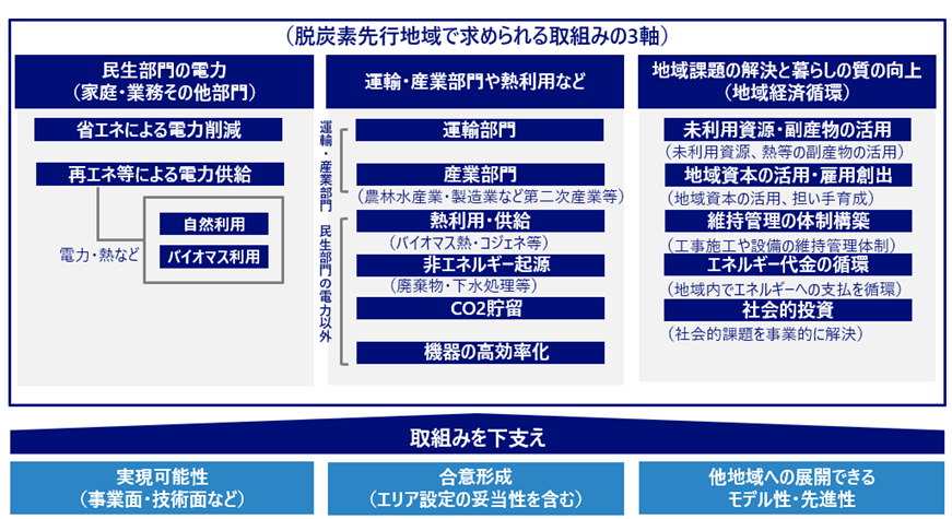 脱炭素先行地域で求められる取組みとしては、大きく3軸あると捉えられます。