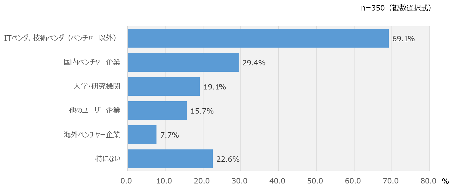 現代のビジネス環境は市場競争が激化し、競合他社との差別化が難しくなってきており、競争力の獲得が求められます。競争力を獲得する手段として、日々技術の進化や新しい革新が生まれているデジタル技術の活用が一つの選択肢になります。しかし、デジタルの領域は変化が激しく、技術的な観点を中心に自社だけで追随することは困難と言えます。その為、デジタル技術に関する知識・ノウハウを有した外部のパートナーシップを活用することは、一つの有効な手段と言えるでしょう。デジタル化のパートナーシップの相手先としては、図2の通り、ITベンダ、技術ベンダを活用している企業が約7割を占めており筆頭候補になっています。また、ベンチャー企業をパートナーシップの相手としている企業も4割弱あり、日々技術が革新されているデジタル化の領域では革新的なアイデアや独自の技術・サービスを有したベンチャー企業とパートナーシップを築くことも選択肢の一つと言えるでしょう。