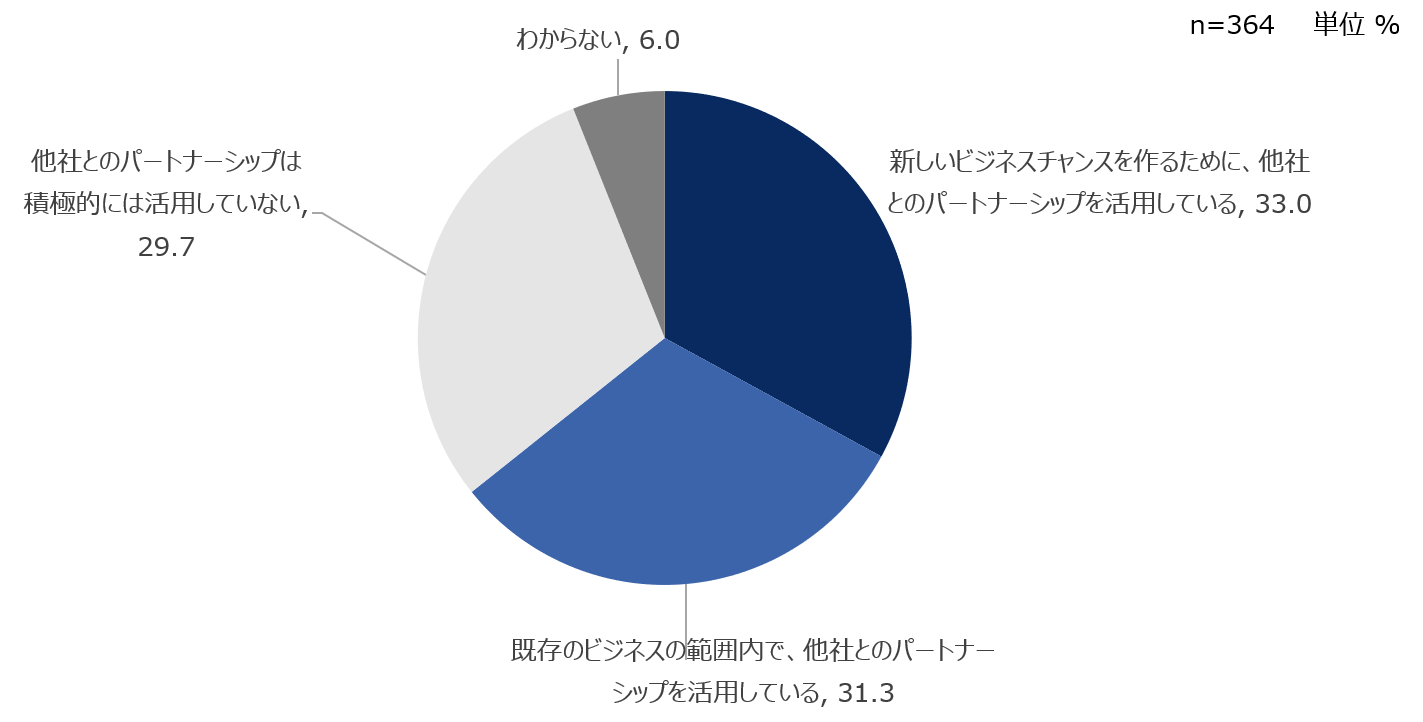 調査では、各社において主要な商品・サービスを開発し顧客に提供する上で、グループ外とのパートナーシップをどのように活用しているかを尋ねています。その結果、新しいビジネスチャンスを作るために活用していると回答した企業が33.0%で最も多い回答でした。次に多かったのは既存のビジネスの範囲内で活用しているが31.3%、そして他社とのパートナーシップは積極的には活用していないと回答した企業が29.7%でした(図1)。