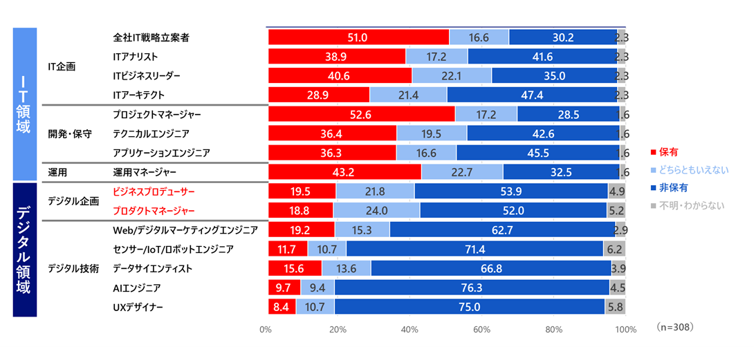 では、各社がデジタル化やDXを推進する上で求められるITケイパビリティ(人員の数、スキルの質など)の保有状況はどうでしょうか。図2の通り、IT領域の企画や開発・保守・運用の分野では3割から5割程度の企業がケイパビリティを一定程度保有しています。一方、デジタル領域における企業のケイパビリティは、全ての職種で2割以下に留まり、全体的にIT領域より低くなっています。特筆して、図1で内製化意向が6割を超えていたデジタル企画を担うIT人材(ビジネスプロデューサー・プロダクトマネージャーの2職種)は、内製化意向の3分の1にも満たない結果となりました。