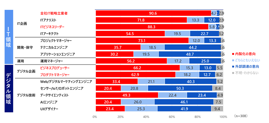 その結果、職種によって、内製化および外部調達の意向が異なることがわかりました。特に、IT領域では、全社IT戦略立案者、ITビジネスリーダーは約9割、デジタル領域では、ビジネスプロデューサー、プロダクトマネージャーについては6割以上の企業が内製化の意向を示しています(図1)。一方で、デジタル技術のスペシャリストは外部調達の意向が強い傾向があります。