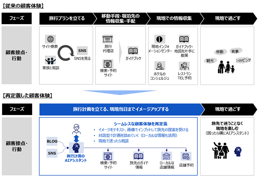 事例1を例に、旅行を計画する際の情報収集や手配の顧客体験について考えてみましょう。これまでは、移動手段、宿泊先、イベントの手配をそれぞれ異なる検索・予約サイトで行い、さらに現地に到着してからはローカルな情報を集めるためにさまざまな情報源を探し求めるという、断片的で繋がりのない顧客体験が一般的でした。これに対し、米Tripnotesのアプローチは、ユーザーが一連の対話の流れで具体的な旅行計画を立てていけるようにするというものです。旅行計画を再定義し、よりスムーズで統一感のある顧客体験を提案していると評価できます。